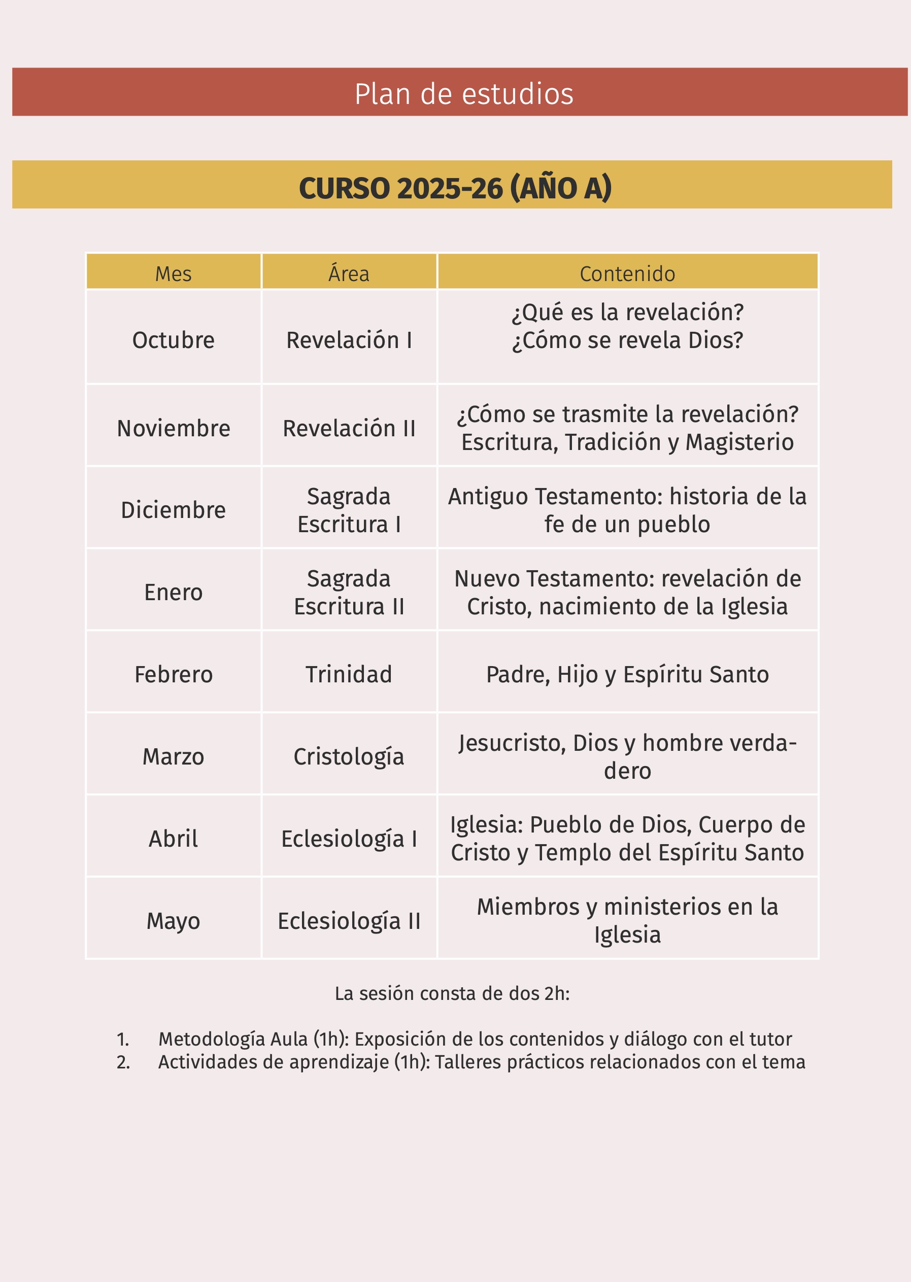 - Presencial (Año A): Una sesión mensual de dos horas consistente en la explicación del tema por parte profesor y, una segunda parte práctica para poder desarrollar las distintas herramientas y destrezas necesarias en el ejercicio de los ministerios. La evaluación requiere la asistencia y participación al 85% de las sesiones presenciales.